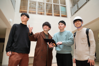今年度の例で言えば、本校の校長補佐(次世代教育推進担当)でもある外山茂浩教授も担当した本演習に大きな成果を期待しています。それは、電子機械システム工学専攻1年の堀内宏輔さん、山口友也さん、渡辺麟さん、そして環境都市工学科専攻1年の恩田樹安さんがチームを組んで挑んでいる『製造現場作業員の配置を最適化する動線の解析、並びに自動部品運搬ロボットの導入』 という取り組みで、作業員の動線解析を行うためにヘルメットのマーカーを読み取る位置情報検出技術や、運搬ロボットをジェスチャーコントロールで遠隔操作するために骨格検出とAI判定の導入を図るなど、チャレンジングな内容になっています。