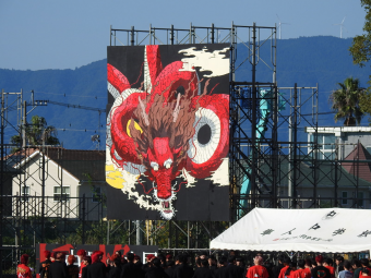 見逃せないのが、応援席の後方に組まれた櫓に立てかける数メートル四方の巨大な板に描かれた櫓絵(やぐらえ)です。