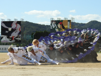 この櫓絵の前で、応援団たちは一糸乱れぬ演舞を披露します。この応援団に入りたいがために入学してくる中学生もいるほどです。