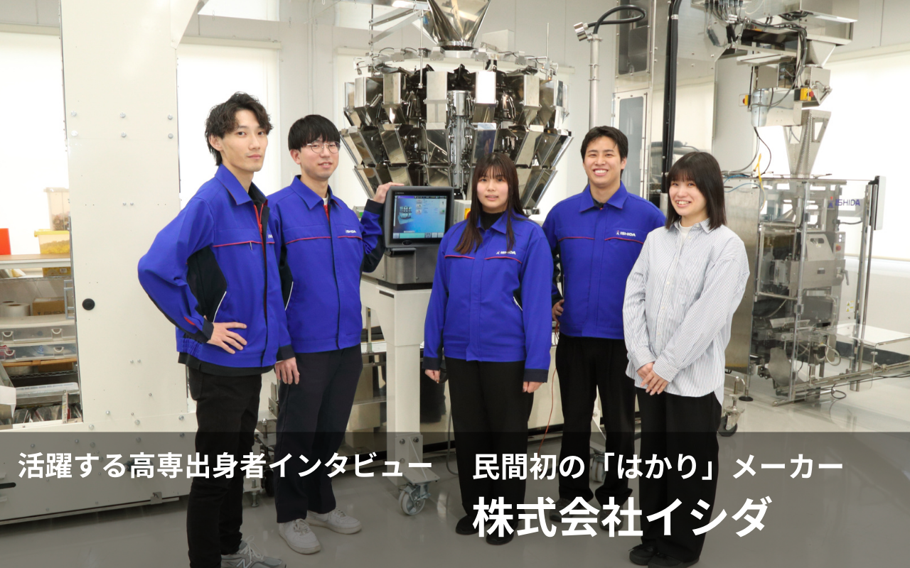 イシダの大きな特徴は、高等専門学校(以下、高専)の設立当初から卒業者の採用に注力 してきたことです。選考段階から、本人の配属希望を重視し、意欲と実力を最大限に引き 出して業務に取り組めるように取り計らいます。今回は5名の高専卒社員にイシダにおけ る高専出身者の活躍ぶりとそれを引き出す風土についてお聞きしました。