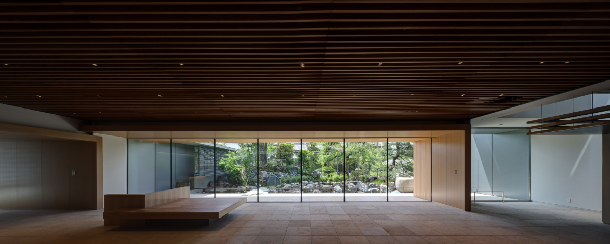 京都市内平安神宮の近隣にある本社のエントランスから望む庭園。