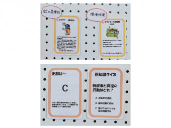 下部:イベントカード例。脱炭素や防虫の基礎知識が(クイズ形式で)問われる。
