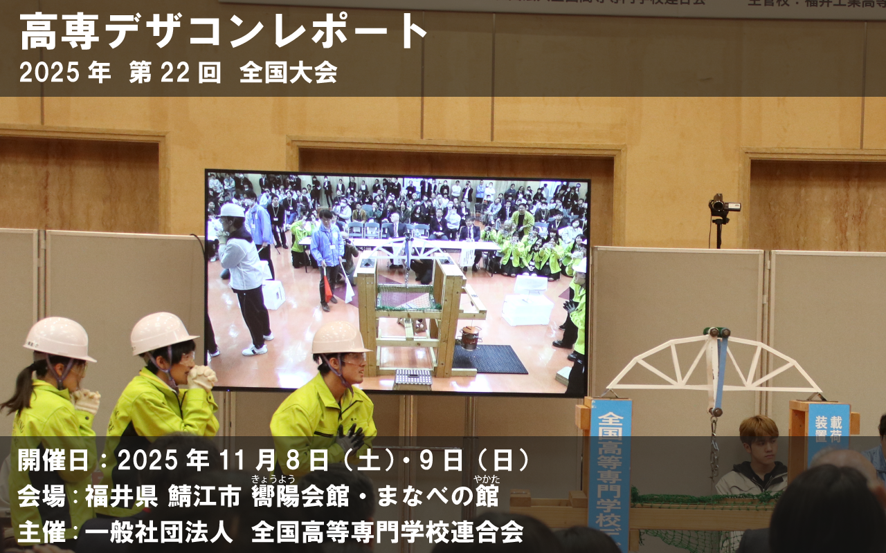 全国高等専門学校デザインコンペティション(以下、高専デザコン)は、高専生を対象とした、社会や生活環境に関連する様々な課題への取り組みを通じて、各高専で養い培われた技術力とデザイン力を競う大会です。 高専デザコンは毎年開催され、高専生が全国規模で競い合うロボットコンテスト(ロボコン)やプログラミングコンテスト(プロコン)、英語プレゼンテーションコンテスト(プレコン)と並び、4大コンテストの1つに位置付けられています。 全国の国立・公立・私立の高専58校63キャンパスならびに海外の高専から、主に土木・建築を専攻する学生たちが参加し、構造デザイン部門、空間デザイン部門、創造デザイン部門、AM(Additive Manufacturing:3D造形)デザイン部門、プレデザコン部門の5部門で競います。