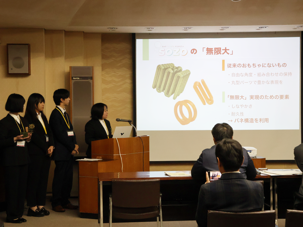 サレジオ高専は、ブロック型の知育おもちゃ「SOZO(そぞ)」を提案しました。部門テーマである「人と人が豊かにつながるものづくり」に基づき、AMの設計自由度を生かし、遊びから自然に想像力と対話が生まれる体験づくりを目指した作品でした。