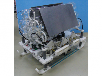 その結果、床に当たった縄はそれ程跳ねることなく、ほぼ床と平行に低い位置で直線的に走っているという事実を確かめることができました。この結果を踏まえてロボットのジャンプに必要な高さを割り出してジャンプ機構を設計しました。ジャンプの方法はペットボトルに詰めた圧縮空気を塩ビパイプで作ったエアーシリンダーに送り、シリンダーが伸びる勢いでジャンプするというものでした。また、ロボットを軽量化するために当時どこの高専も使っていなかった3Dプリンタで製作したパーツを随所に使用しました。このようにして出来あがったのが徳山高専の「色とりドリィ」です。
