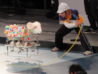 「高専ロボコン2013」の課題は「Shall We Jump?」。生き物を模した2台のロボットと3名の選手が協力して縄跳びをして、その速さや連続ジャンプの回数を争う競技でした。