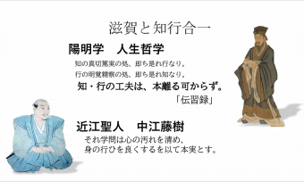 次に、レオナルド・ダ・ヴィンチの残した「レオナルドの手稿」に記された多くの技術に関する基礎検討とそれらから得た科学的な知識、またそれらを実践する行動力の重要性にふれつつ、北村氏の県立高専総合ディレクター就任時に公表された滋賀県立高専のコンセプトである科学的な知識(知)と合理的な行動力(行)をバランスよく涵養する「知行合一」の技術者育成の考えを説明されました。「知行合一」という言葉は元々、中国の陽明学(*)の言葉で、日本では近江聖人と呼ばれる中江藤樹によって広められ滋賀という土地と縁深い言葉です。