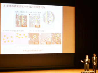 今後は、自己修復時に平滑に塗膜されるようカプセルの分散位置や形態を調整し、より効果的な自己修復性を実現するとの展望を述べました。