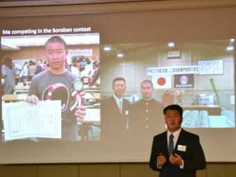 山田さんのプレゼンテーションのタイトルは、「The Wonder of the Abacus」です。幼いころからそろばんを習っている山田さん自身の実体験やそろばんの歴史、そろばんの効用に関する既往研究についての紹介等を行いました。