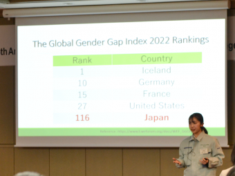 佐川さんは、国土交通省、建設会社に勤務する女性土木技術者にインタビューを行い、その中で女性管理職の少なさや育児のために仕事の幅が制限されるという現場の実状を聞き、日本と世界を比較すると女性の社会進出が進んでいないことが改めて浮き彫りになったと言及しました。この現状を変え、「ドボジョ(※)」としてのキャリアを叶えつつ母親になりたいという将来の夢について発表しました。