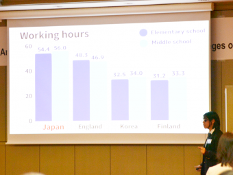 森本さんのプレゼンテーションのタイトルは、「Just One Suggestion」です。小・中学校での教育現場の問題点とその解決方法の提案を行いました。