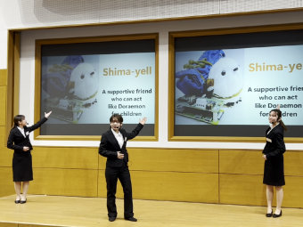 石川高専のチームは、子どもの意見発信を支援するコミュニケーションロボット「シマエーる」を紹介しました。