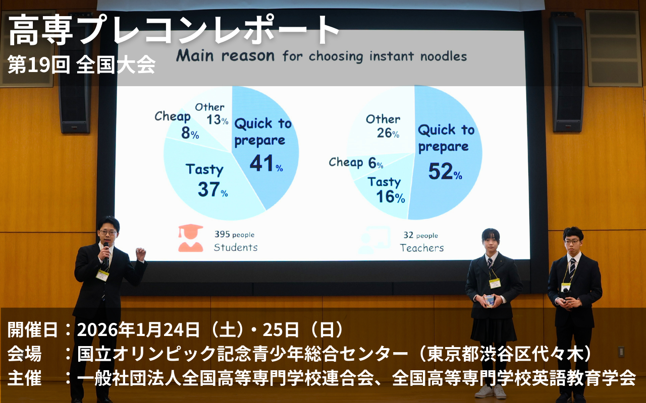 「英語が使える高専生」をスローガンに2007年から開催されており、高専生の英語表現力の向上や学校間の交流促進を目的としています。また、ロボットコンテスト(ロボコン)、プログラミングコンテスト(プロコン)、デザインコンペティション(デザコン)と並ぶ、高専4大コンテストの一つとしても広く知られています。