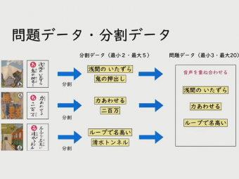 今年の競技部門は、開催地群馬県の郷土かるたである上毛かるたを使用し、”音” がテーマの競技を行いました。競技に使用するのは、上毛かるた44枚の読み札の音声データです。始めに問題となる複数の読み札の音声データを、それぞれ時間軸方向に分割し、分割音声データを生成します(最小2個・最大5個、ただし分割数は問題で共通)。さらに、分割領域が同じ分割音声データ同士を重ね合わせます(最小3個・最大20個)。重なり合った分割音声データを解析し、合致する取り札を複数選択します。正解した札数、使用した分割データ数の少なさ等により順位を競います。(競技の概要は下図参照※)